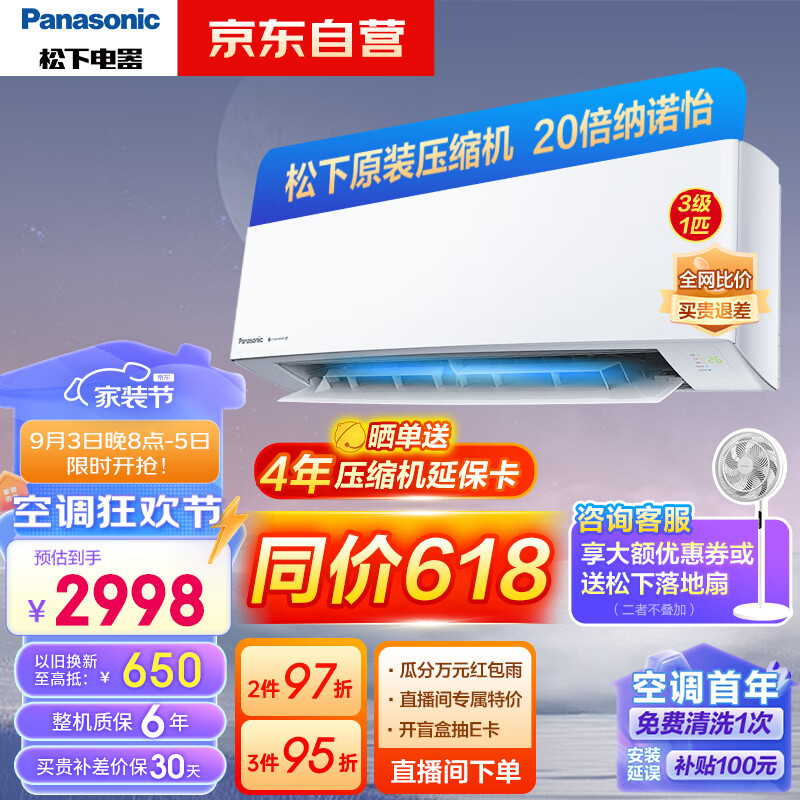 4、618了,刚好换个空调,一直比较信赖松下的电器,第二天送第三天就装上了,可以用app,真的很方便,安装师傅很用心,空调效果很好,可以愉快的过夏天了