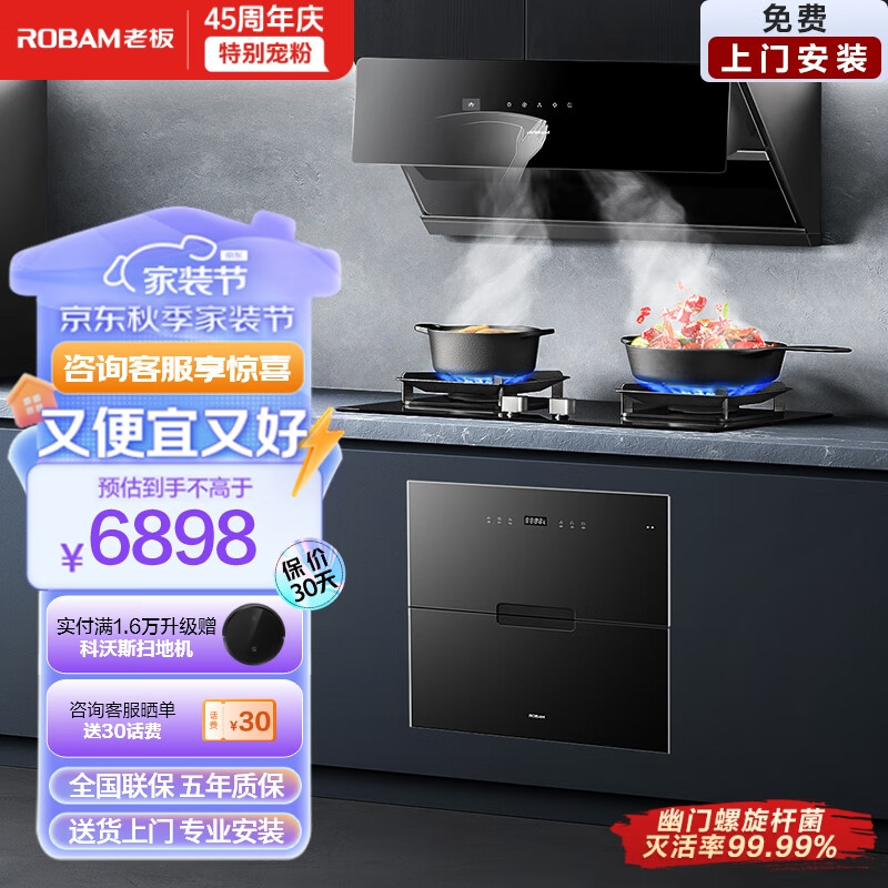 老板(Robam)抽油烟机探索家A8CS智能变频聪明25m3/min灶具消毒柜三件套29A8CS+57B6D+XB710A(天然气)价格:6897.00元!