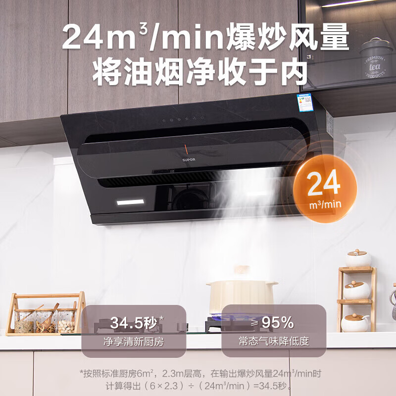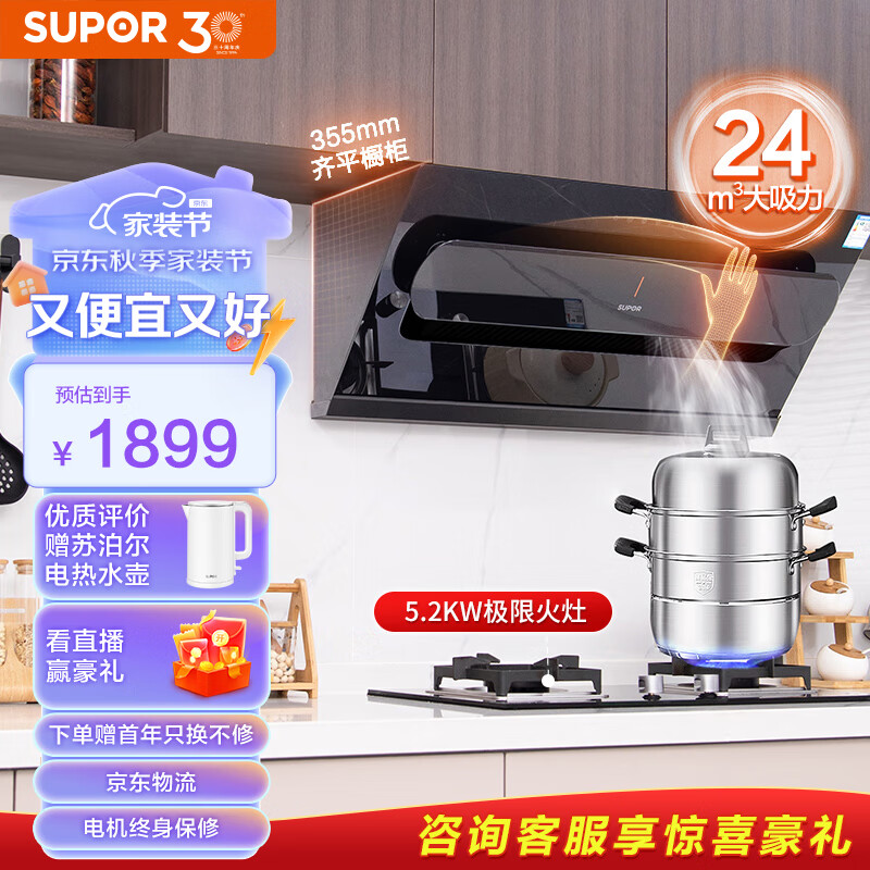 苏泊尔(SUPOR)抽油烟机 24m3/min大吸力 变频侧吸式脱排抽吸油烟机 挥手智控免拆洗烟灶套装 DJ50S+DB27天然气价格:1899.00元!