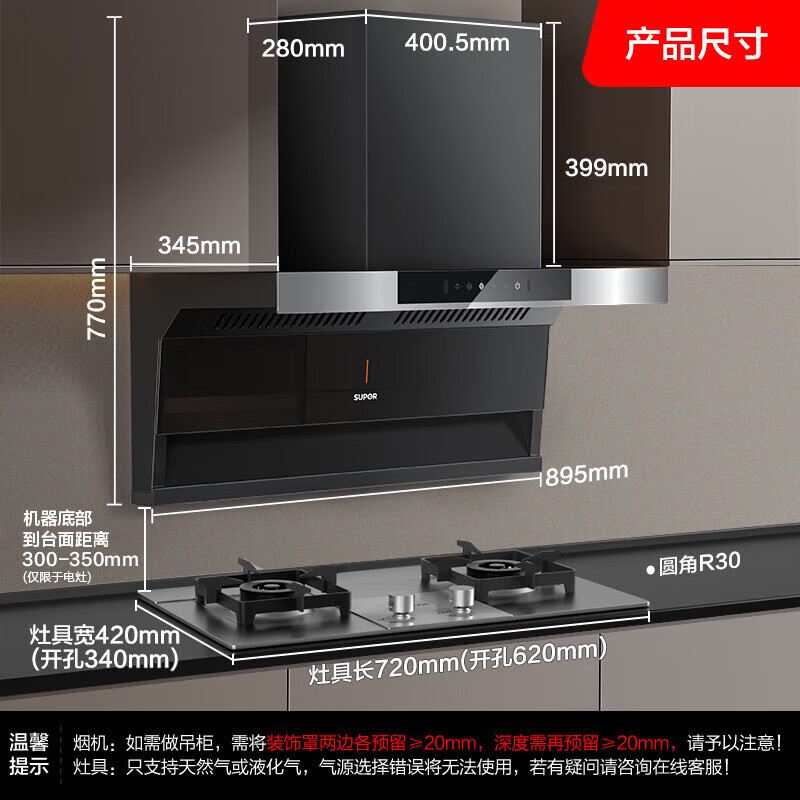 4、烟机灶具套装物有所值,抽烟效果很好,吸力大,厨房密封好的话,需要开一点窗户,噪音符合标准,燃气灶定时效果很好用。
