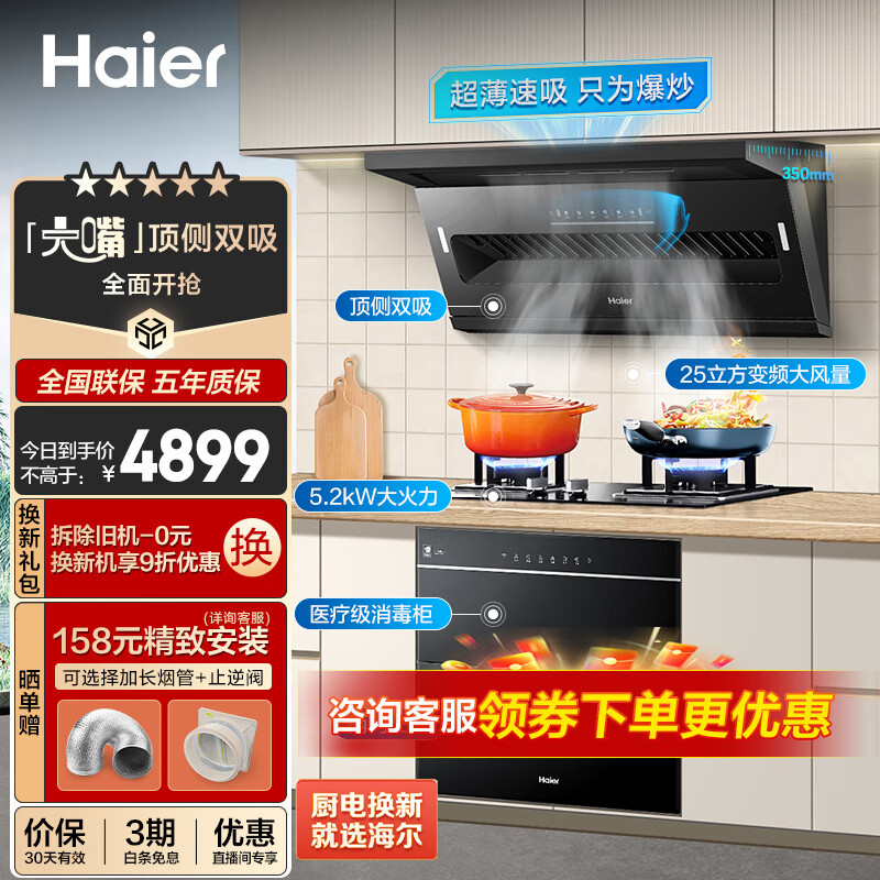 海尔(Haier)抽油烟机 顶侧双吸油烟机燃气灶消毒柜套装 25m3/min大吸力 115L医疗级消毒柜C61+Q2BE3天+E07JU1价格:4899.00元!