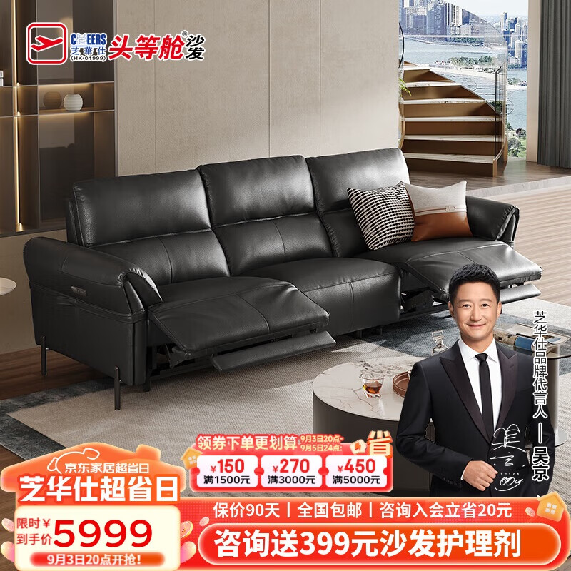 芝华仕(CHEERS)头等舱零靠墙意式轻奢真皮电动功能沙发大户型客厅50795大三黑A价格:5999.00元!