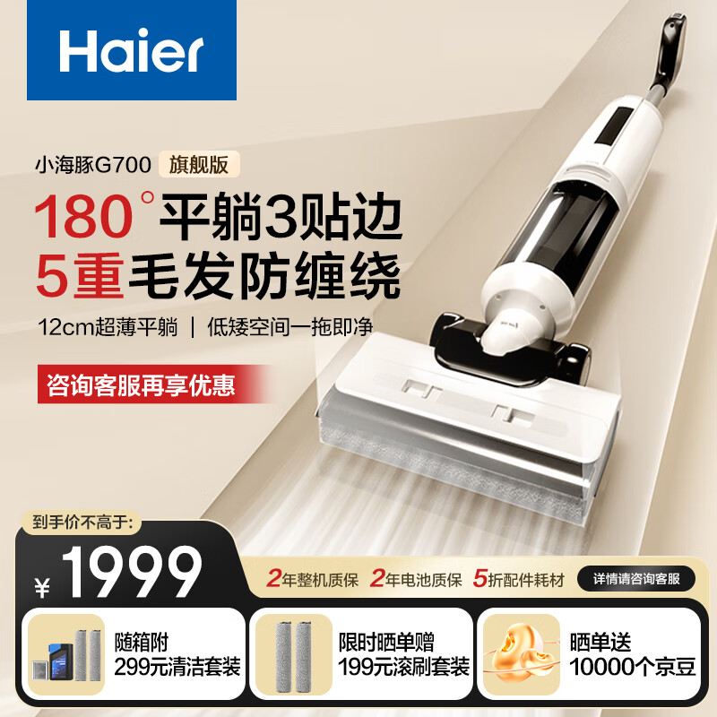 海尔Haier小海豚洗地机G700拖地机洗拖一体自动清洗吸拖一体【180°平躺三面贴边 5重防缠柔烘透干】价格:2199.00元!