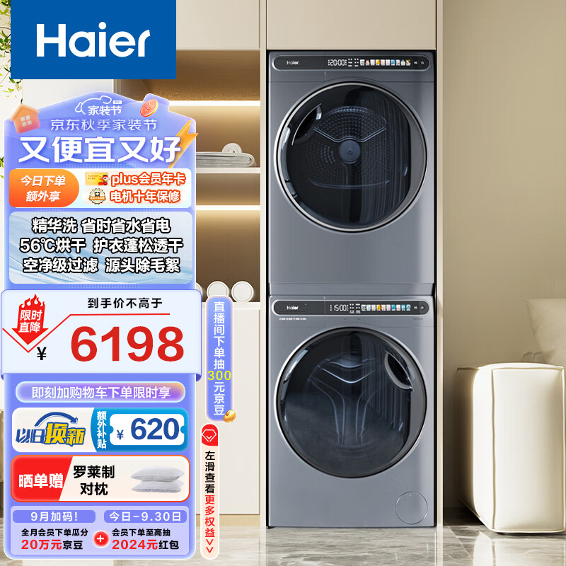 海尔(Haier)59S精华洗洗烘套装 10KG超薄滚筒洗衣机全自动+空净热泵烘干机家用组合 MATESL59S+59 以旧换新价格:6198.00元!