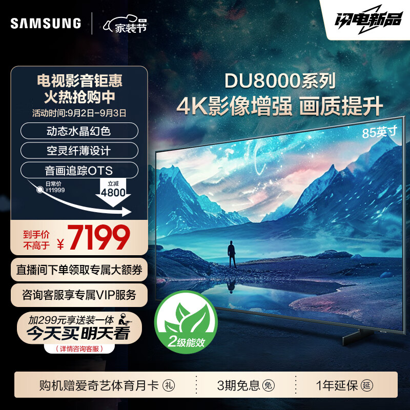 三星(SAMSUNG)85DU8000 85英寸 平板液晶AI电视 超薄4K 无开机广告 UA85DU8000JXXZ 北京以旧换新2级能效价格:7199.00元!