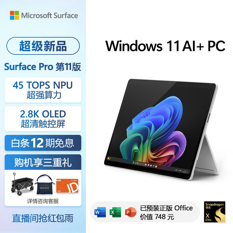 微软(Microsoft)全新Surface Pro第11版 骁龙X Elite 16G 1T 亮铂金二合一平板笔记本电脑 学生平板 AIPC Pro 11价格:13288.00元!