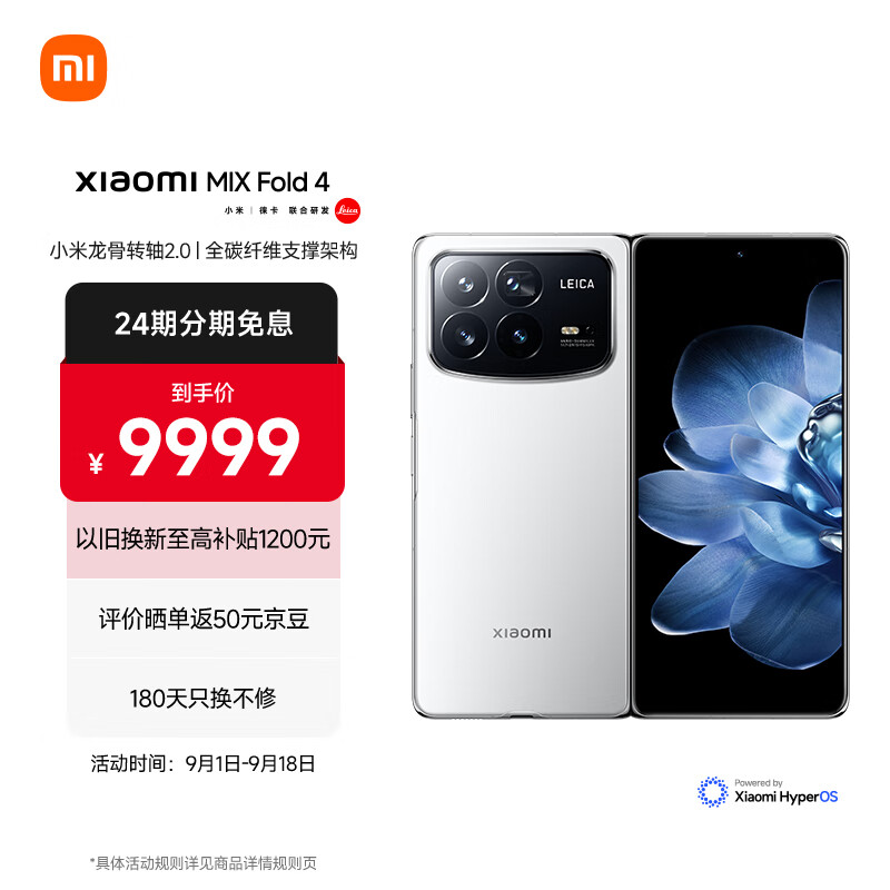 小米(MI)MIX Fold 4 小米龙骨转轴2.0 徕卡光学全明星四摄 第三代骁龙8 16GB+512GB 白色 5g 折叠屏手机价格:9999.00元!