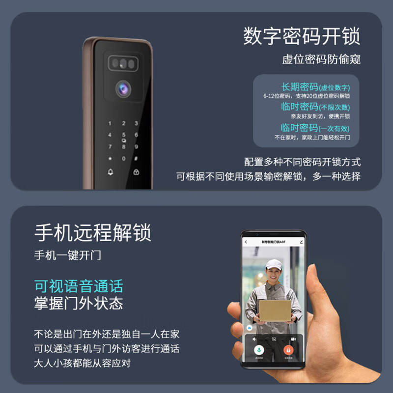 附加功能:防小黑盒,试错报警,虚位密码,防撬报警,电池更换提醒,防试开报警,可视对讲,实时抓拍,虚掩报警,智能语音