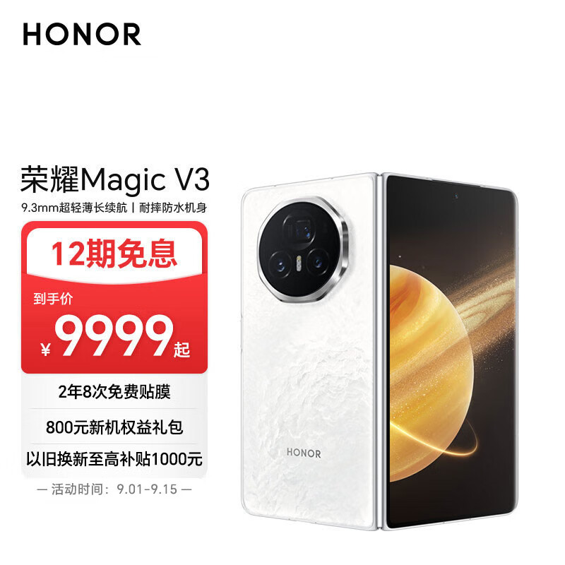 荣耀Magic V3 新款折叠屏 超轻薄长续航 耐摔防水机身 第三代骁龙8 16+512 祁连雪 拍照 5G AI智能手机价格:9999.00元!