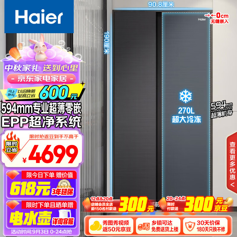 海尔(Haier)512升和景594mm专业超薄零嵌入式对开双开门电冰箱家用一级能效节能无霜净味BCD-512WGHSSB5SYU1价格:5499.00元!