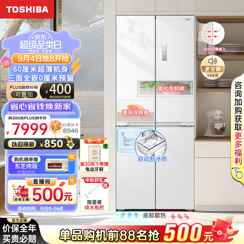 东芝(TOSHIBA)白珍珠系列450无霜60厘米超薄零嵌平嵌入式十字对开门家用自动制冰电冰箱GR-RF450WI-PM151荧纱白价格:8416.00元!