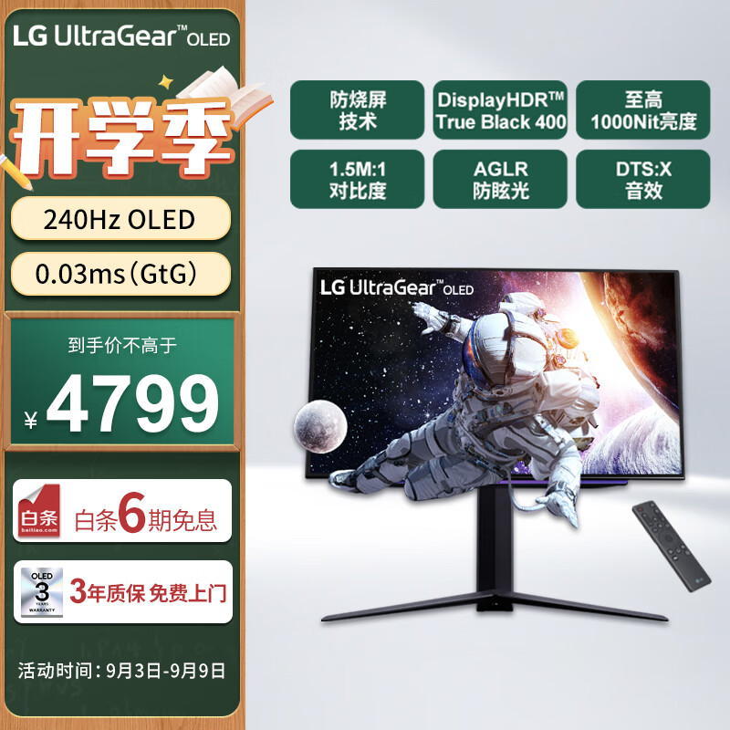 LG 27GS95QE 26.5英寸 OLED 240Hz 0.03ms HDR400 HDMI2.1 G-Sync 防眩光低反射 游戏电竞显示器价格:4799.00元!