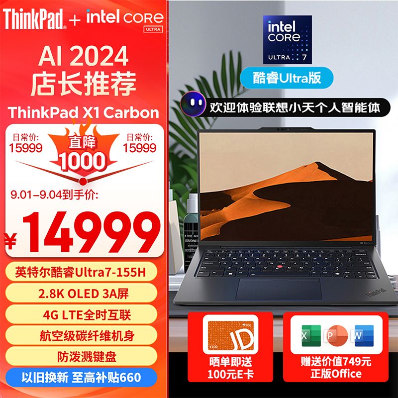 ThinkPad X1 Carbon AI 2024酷睿Ultra7 14英寸全互联商务办公笔记本电脑32G 1T 2.8K OLED超清屏(00CD)价格:14999.00元!