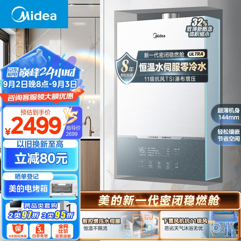 美的(Midea)16升燃气热水器 天然气 恒温水伺服 零冷水 TSI增压 抗风 新一代密闭稳燃舱 JSQ30-MATE Ultra无相价格:2499.00元!