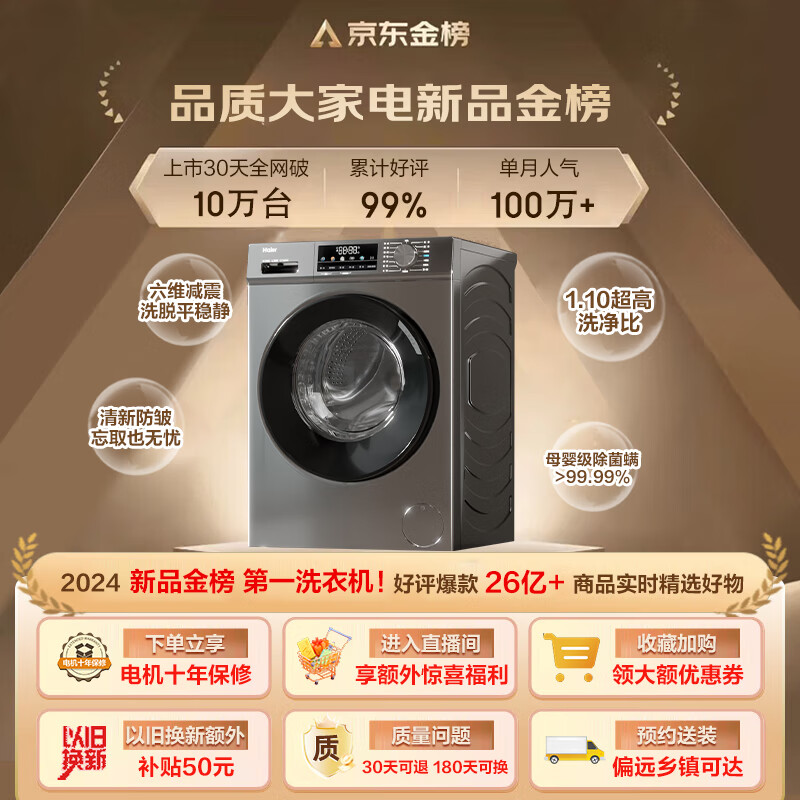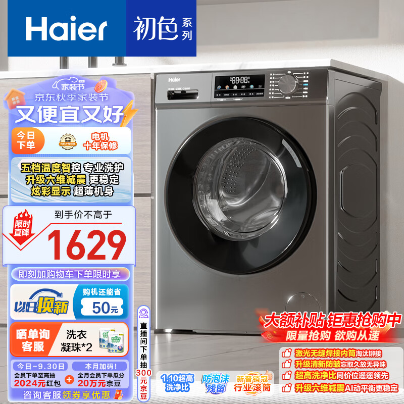 海尔(Haier)滚筒洗衣机全自动 初色超薄 10公斤大容量 1.1洗净比 EG100MATE29S 以旧换新 家用内衣洗 一级能效价格:1799.00元!