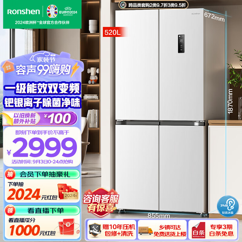 容声(Ronshen)520升十字双对开四开多门电冰箱白色家用超薄变频一级能效节能风冷无霜大容量保鲜BCD-520WD12FP价格:2999.00元!