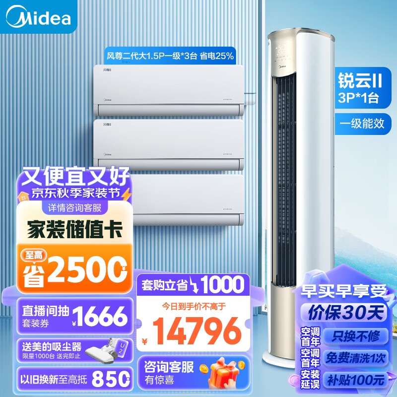 美的(Midea)新一级能效 空调套装 全家福套餐(大1.5匹*3风尊II+3匹锐云II)价格:15796.00元!