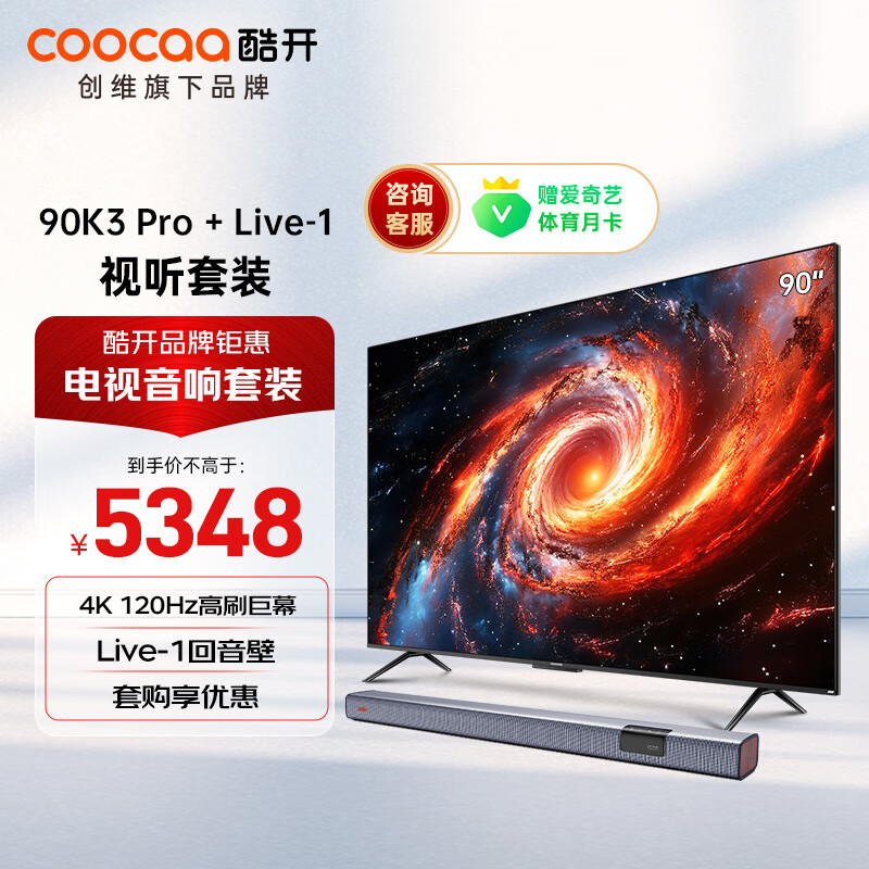 酷开创维 90英寸K3 Pro电视机+音响Live-1 回音壁 客厅家庭影院 壁挂条形音箱 蓝牙影院级娱乐体验套装价格:5348.00元!