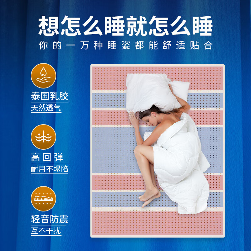 1、关注了很久这款乳胶床垫,收到货了,凉了几天,使用后感觉很满意,包装结实,有钢印,送了两个枕头,和一个护劲的乳胶圈,总体满意.