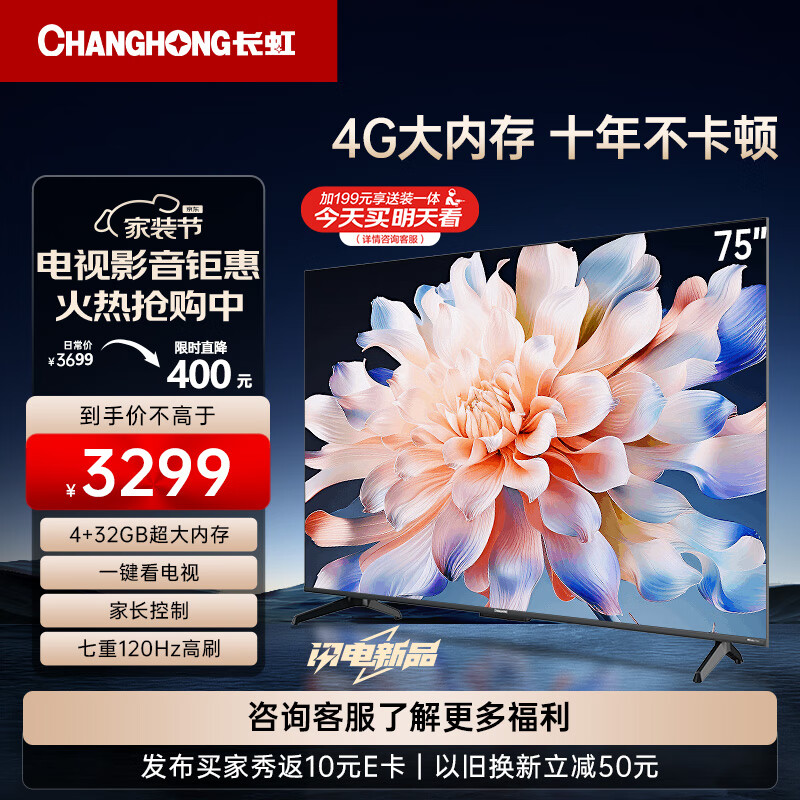 长虹电视75D66F 75英寸4K超高清 4+32GB超大内存 一键看电视 120Hz高刷新液晶电视机 以旧换新价格:3299.00元!