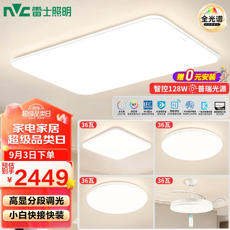 雷士(NVC)语音智能吸顶灯客厅灯led卧室风扇灯全光谱护眼小白灯白雪B舒适光价格:3061.00元!