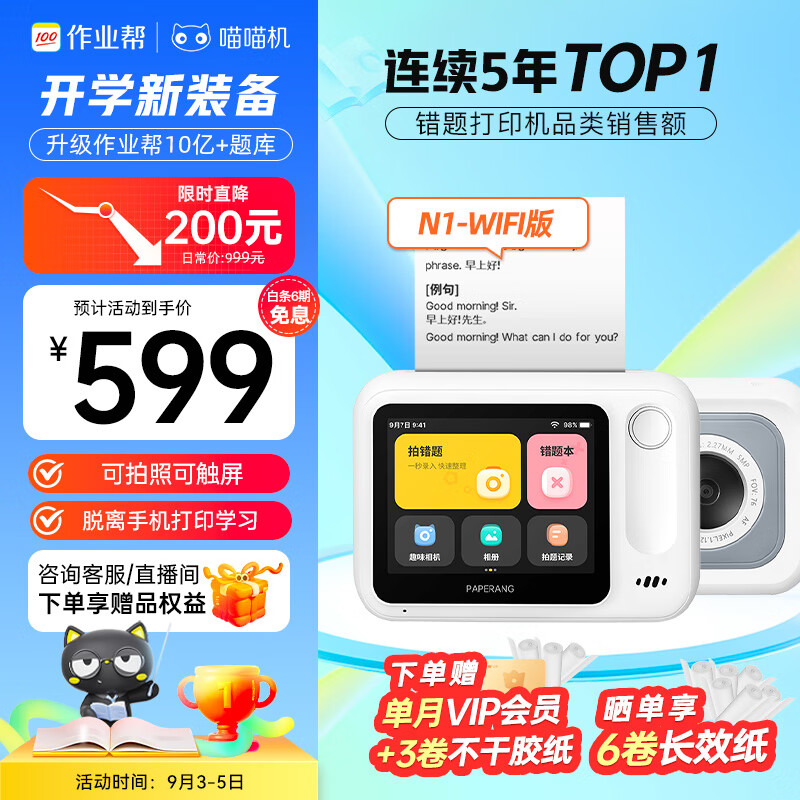 喵喵机N1 高清灰阶作业帮学生错题整理神器家用迷你热敏脱离手机可触屏智能学习错题打印机 WIFI版价格:599.00元!