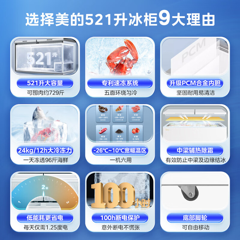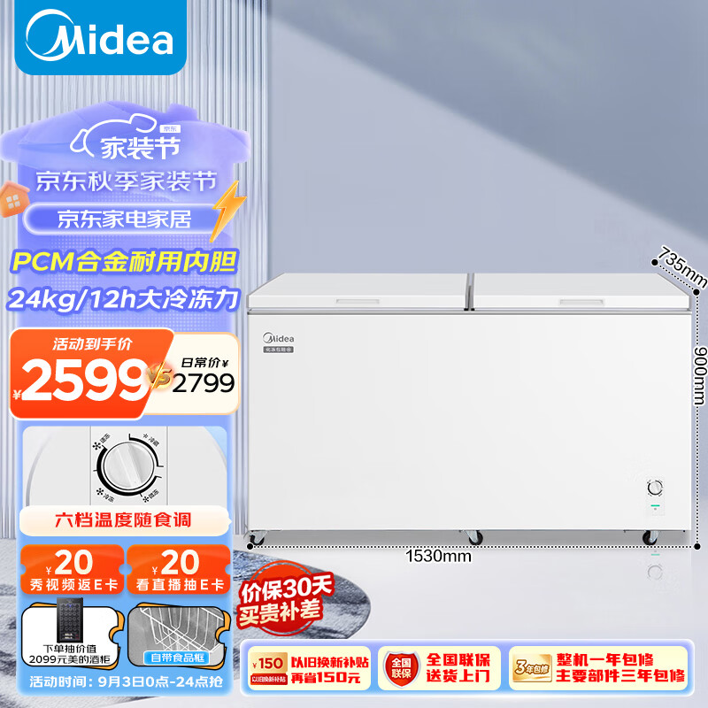 美的(Midea)521升卧式商用家用冰柜 商用大容量 冷藏柜冷冻柜冰柜家用冰箱大冷柜BD/BC-521DKM(E) 以旧换新价格:2599.00元!