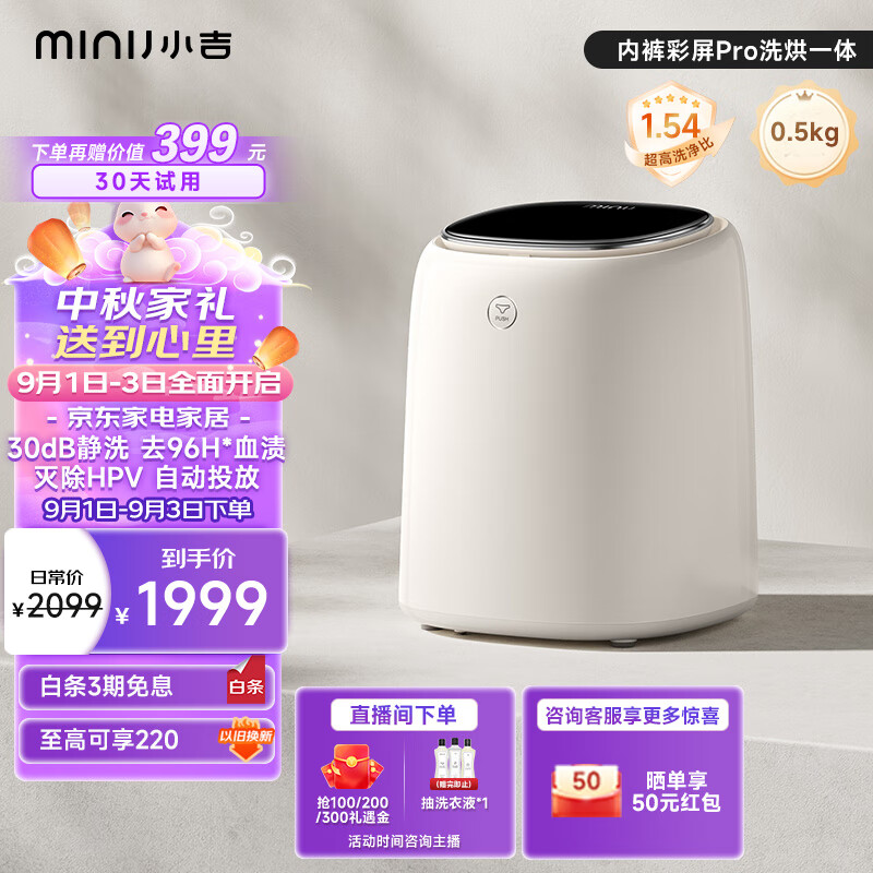 小吉(MINIJ)0.5kg内衣洗衣机小型迷你高温煮洗去血渍洗烘一体变频内裤洗衣机U10-MD PRO价格:1999.00元!