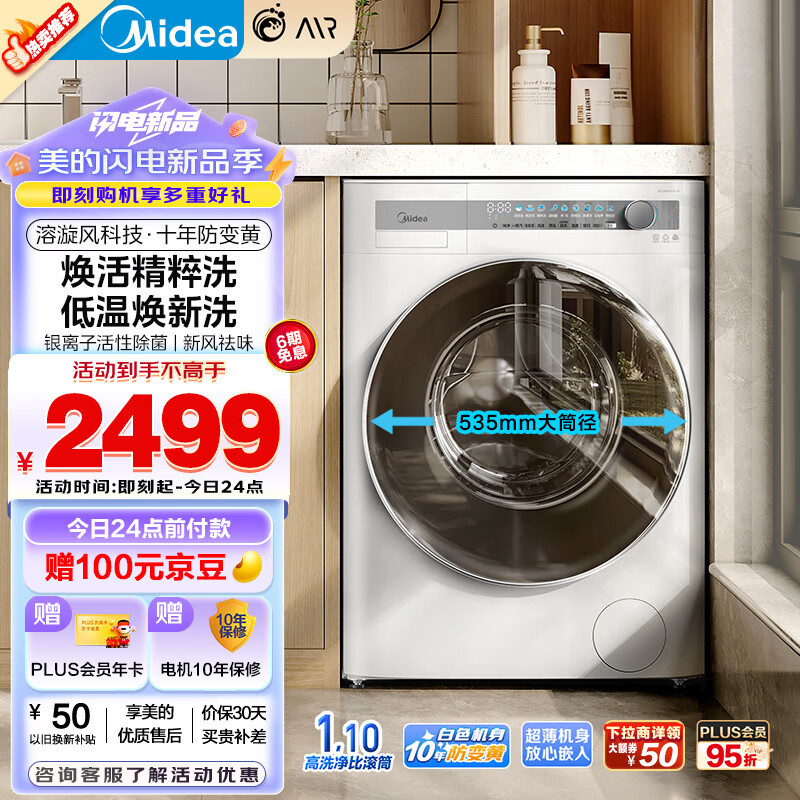 美的(Midea)滚筒洗衣机全自动家用 MG100AIR1 10公斤超薄自由嵌 AIR 焕活精粹洗 1.1洗净比 银离子活性除菌价格:2499.00元!