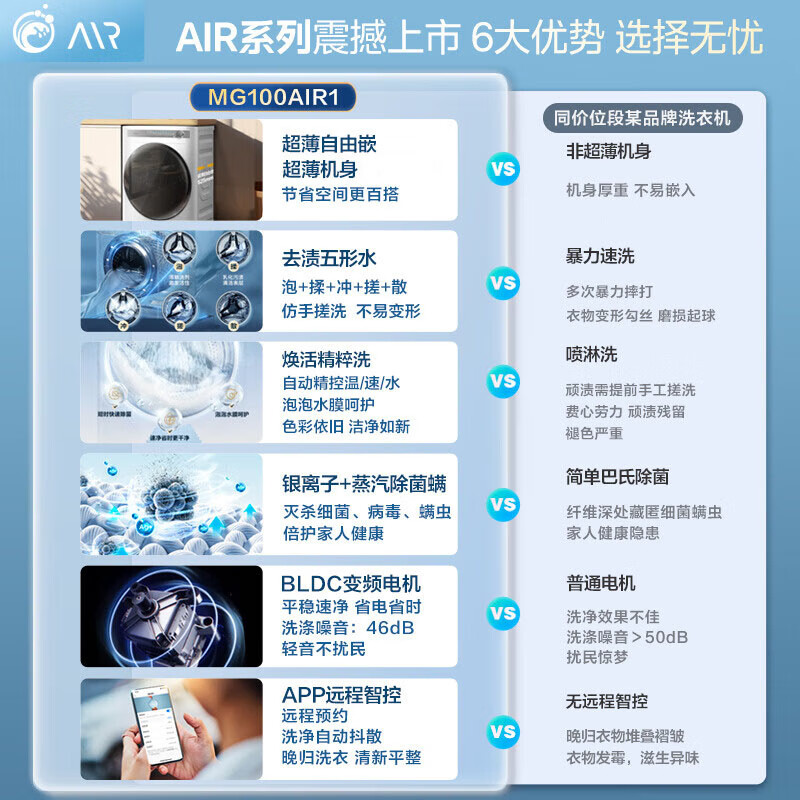 说句大实话美的MG100AIR1是我喜欢的外观,质量还不错,外形外观:白色特别好看,和现代风格十分适配洗净效果:特别干净,残留污渍清除得很好除菌效果:不错,高温杀菌容量大小:可以放下十几件衣服,大的被套床单也没有问题,非常好