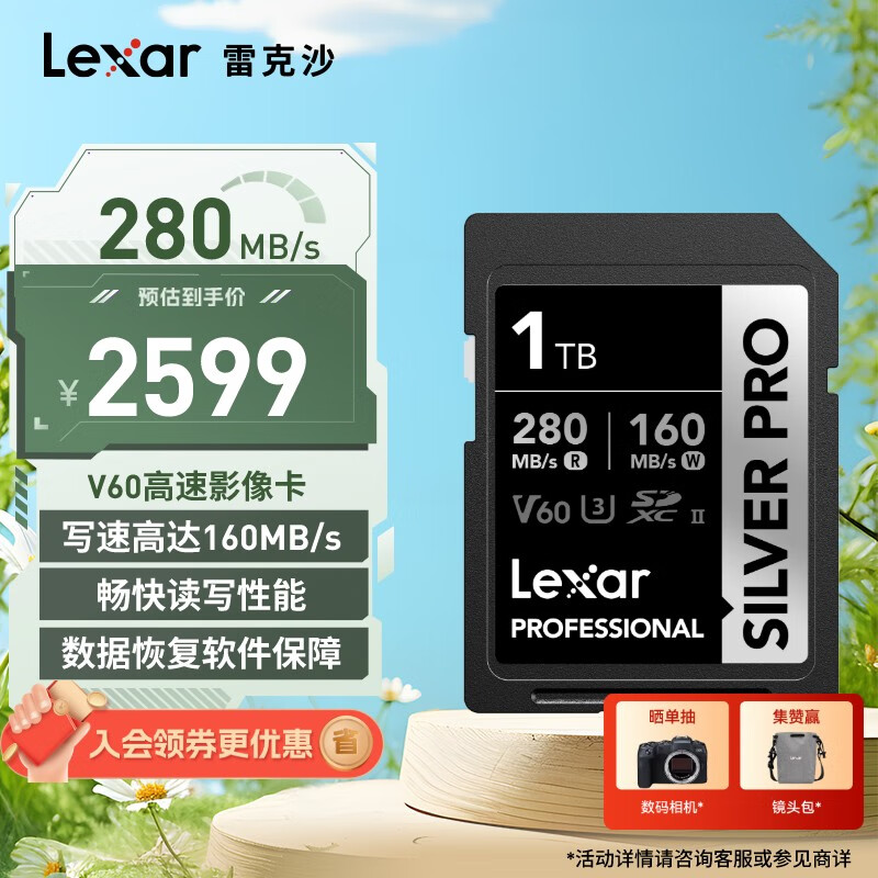 雷克沙(Lexar)1TB SD存储卡 C10 U3 V60 4K相机内存卡 读280MB/s 写160MB/s 捕捉光影(SILVER PRO) 价格:2599.00元!
