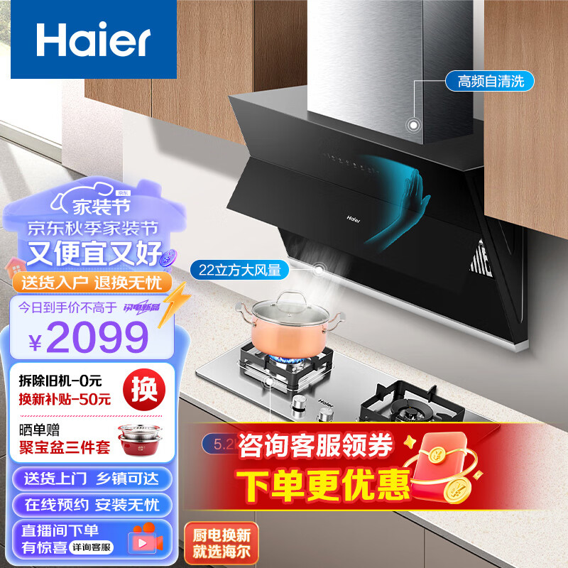 海尔(Haier)抽油烟机 侧吸式烟灶套着 22m3/min大吸力 5.2kw不锈钢灶具 油烟机燃气灶套装MA2C1价格:2099.00元!