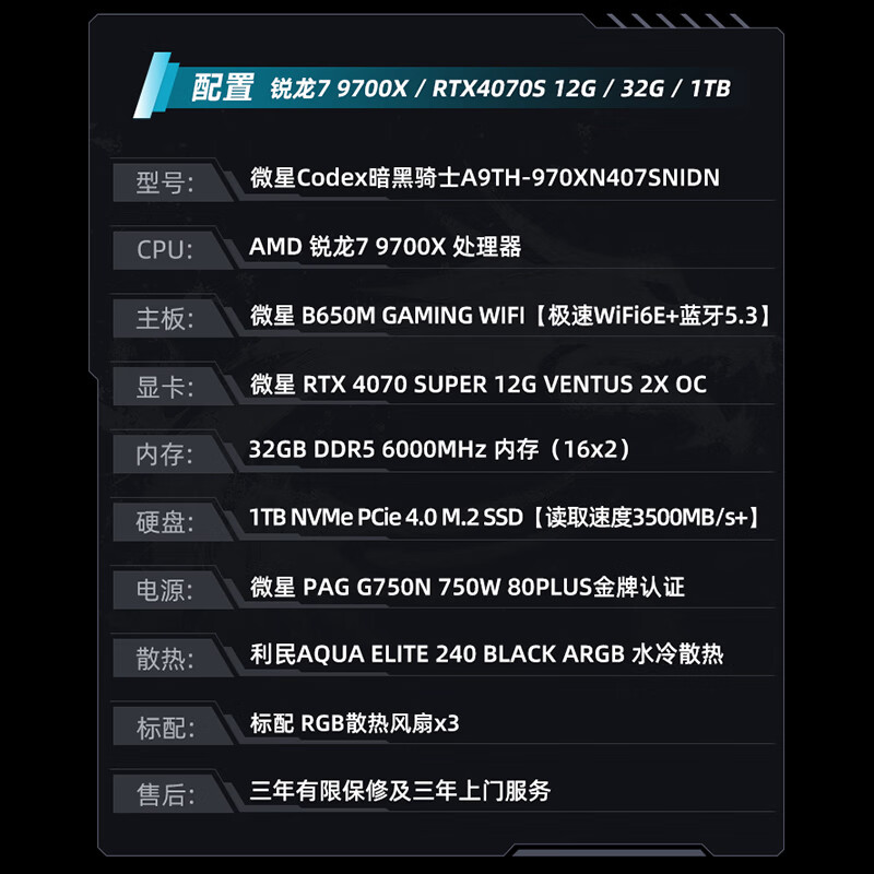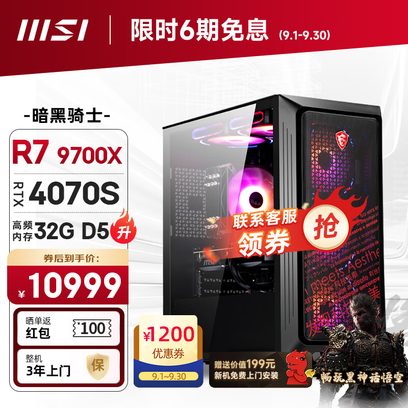 微星(MSI)暗黑骑士AMD锐龙R7 9700X/RTX4070Super/32G/1T黑神话悟空游戏设计师台式电脑主机diy组装整机价格:12699.00元!