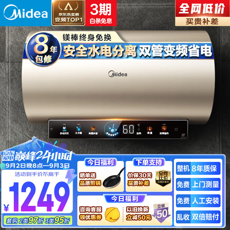 美的(Midea)终身免换镁棒60升电热水器3300W/2300W速热变频省电一级能效节能水电分离大水量F6033-JE6(HE)价格:1449.00元!