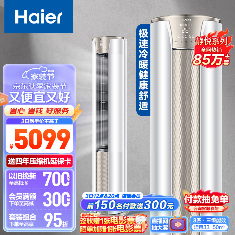 海尔(Haier)3匹 静悦 新能效变频客厅家用空调立式柜机 自清洁 立式空调 KFR-72LW/06KCA83U1 以旧换新价格:5099.00元!