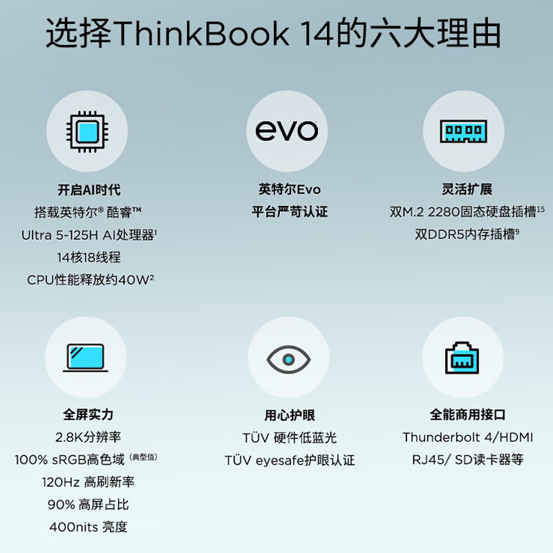 ThinkPad联想笔记本电脑ThinkBook 14 2024英特尔Evo认证酷睿Ultra5 125H 14英寸16G 1T 2.8K AI高刷屏办公价格:4899.00元!