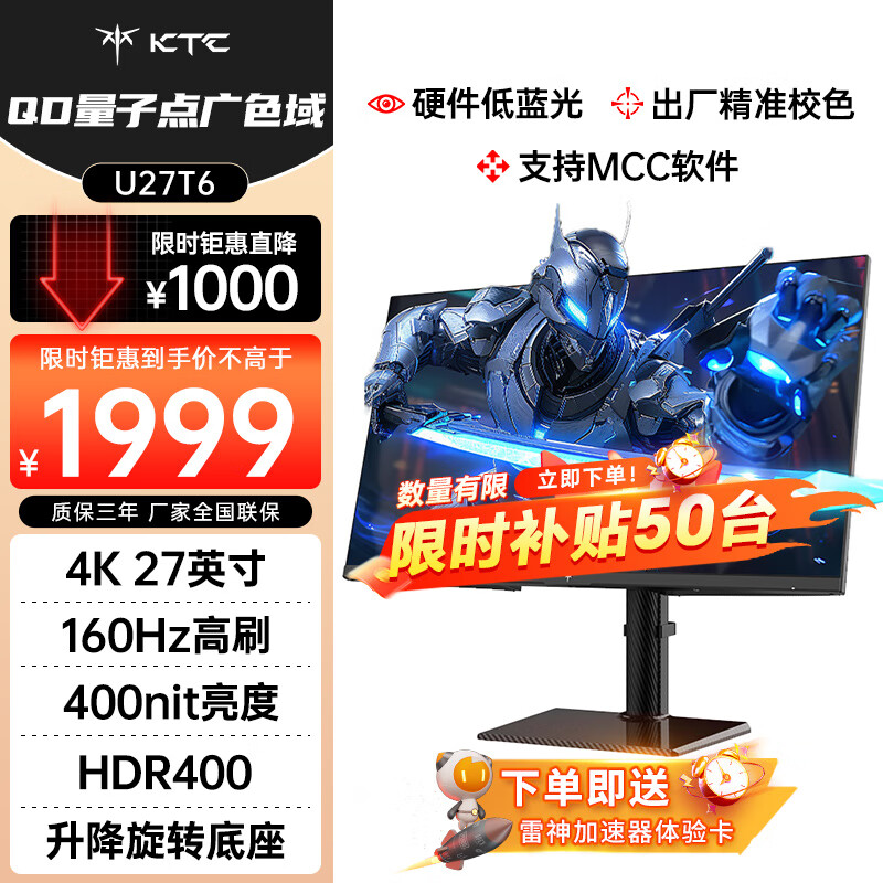 KTC 27英寸 电脑显示器 原生4k160Hz FastIPS1ms HDR400 硬件低蓝光 升降旋转壁挂电竞4k显示屏U27T6价格:1999.00元!