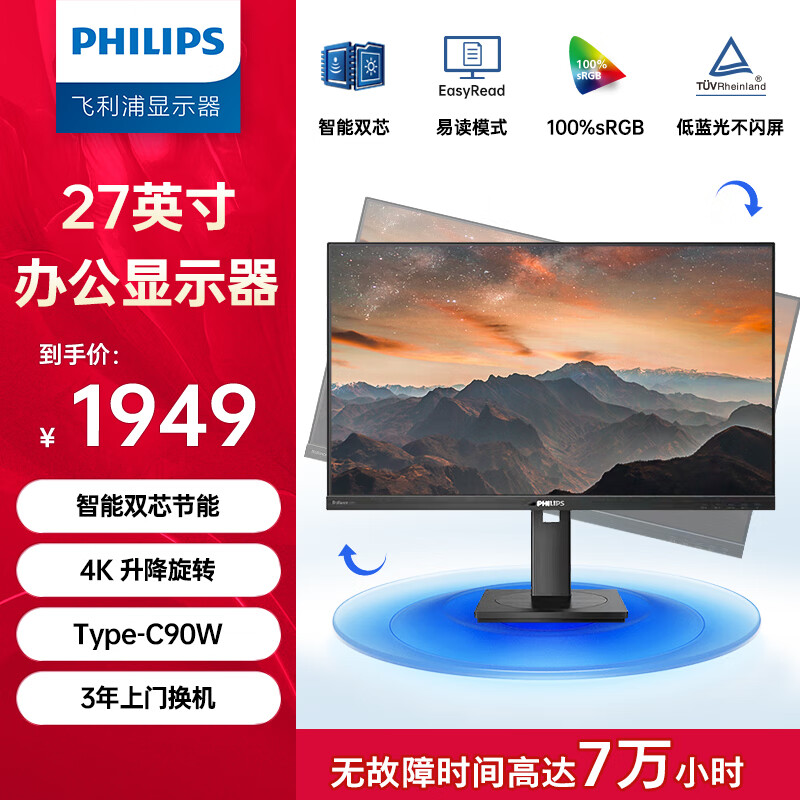 飞利浦(PHILIPS) 27英寸办公显示器 4K高清 低蓝光护眼 IPS Type-C90W 音响 旋转升降 智能双芯电脑显示器 279P1价格:1949.00元!