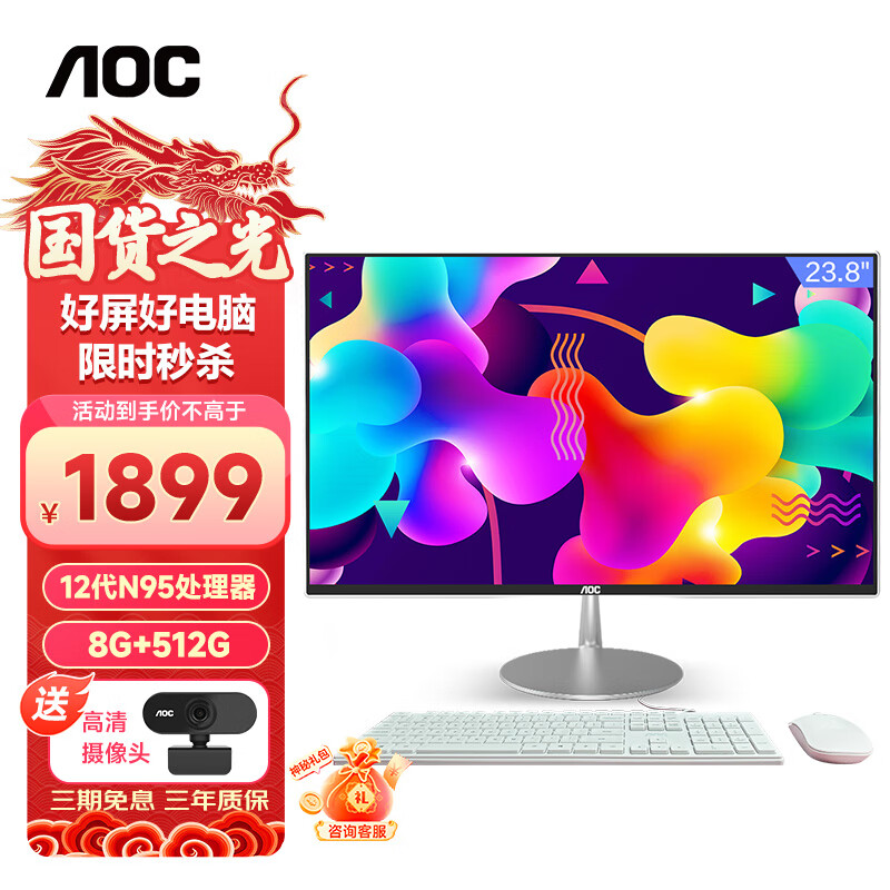 AOC美人鱼734 23.8英寸高清家用办公一体机电脑台式(12代N95 8G 512G 双频WiFi 3年上门)白价格:1899.00元!