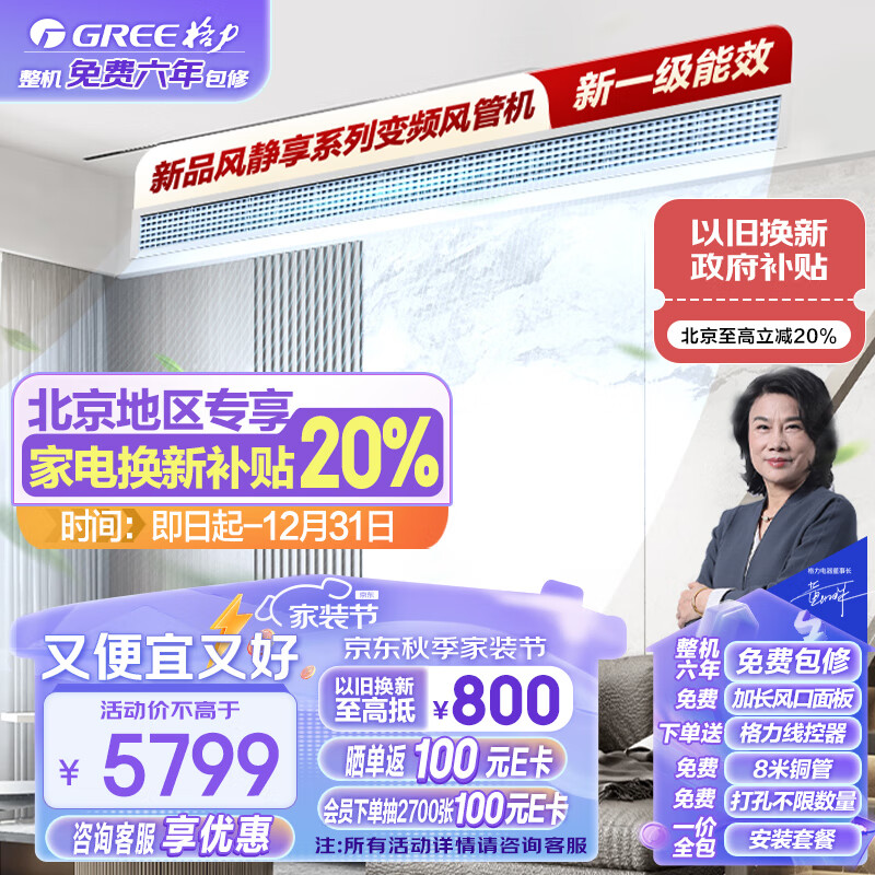 格力(GREE)中央空调 风管机一拖一 K+风静享 大1匹家用嵌入式空调1级能效FJR2.6Pd/Cb4Nh-N1京派(一价全包)价格:5799.00元!