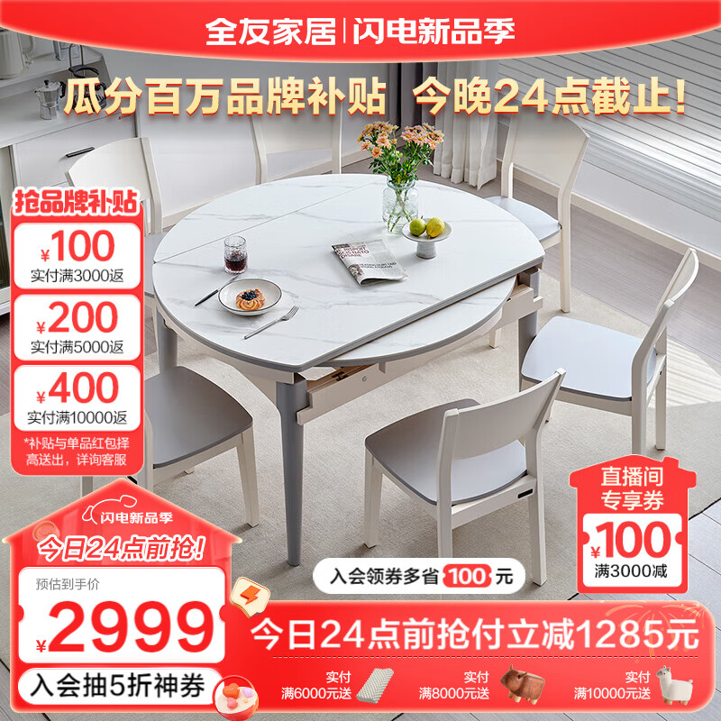 全友家居 可伸缩折叠岩板餐桌现代简约餐桌椅组合家用吃饭桌子DW1028价格:4284.29元!