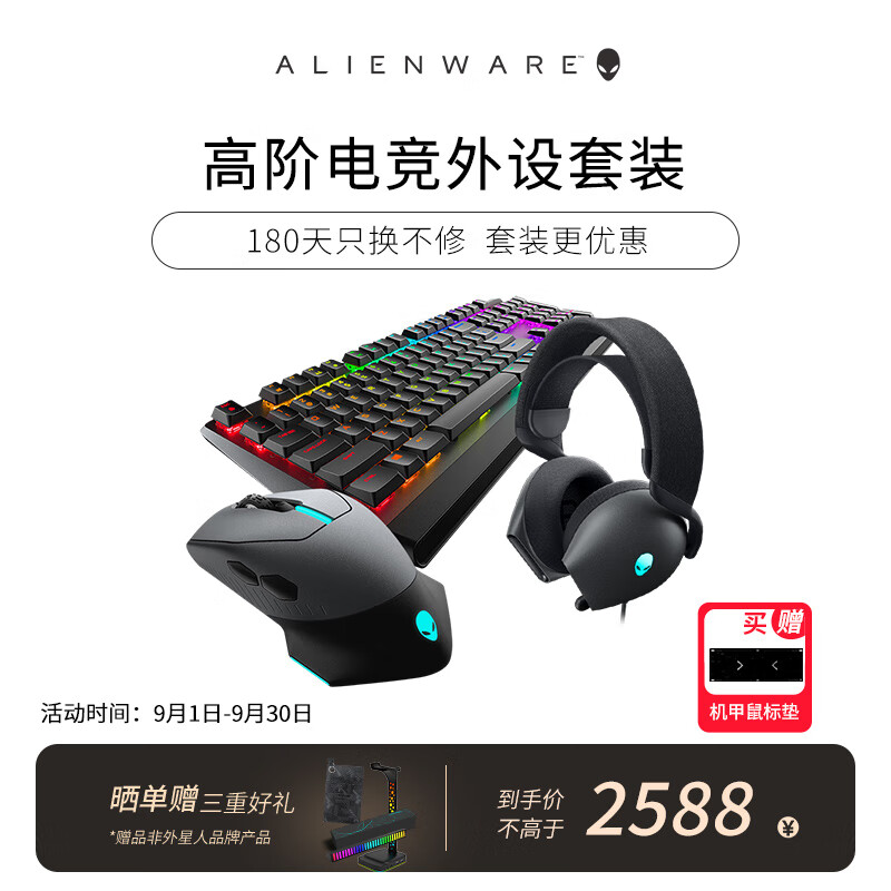 外星人(Alienware)610M+510K+520H 游戏电竞三件套装(无线游戏鼠标 有线机械键盘 电竞耳机)畅玩黑神话RGB高端外设价格:2562.10元!