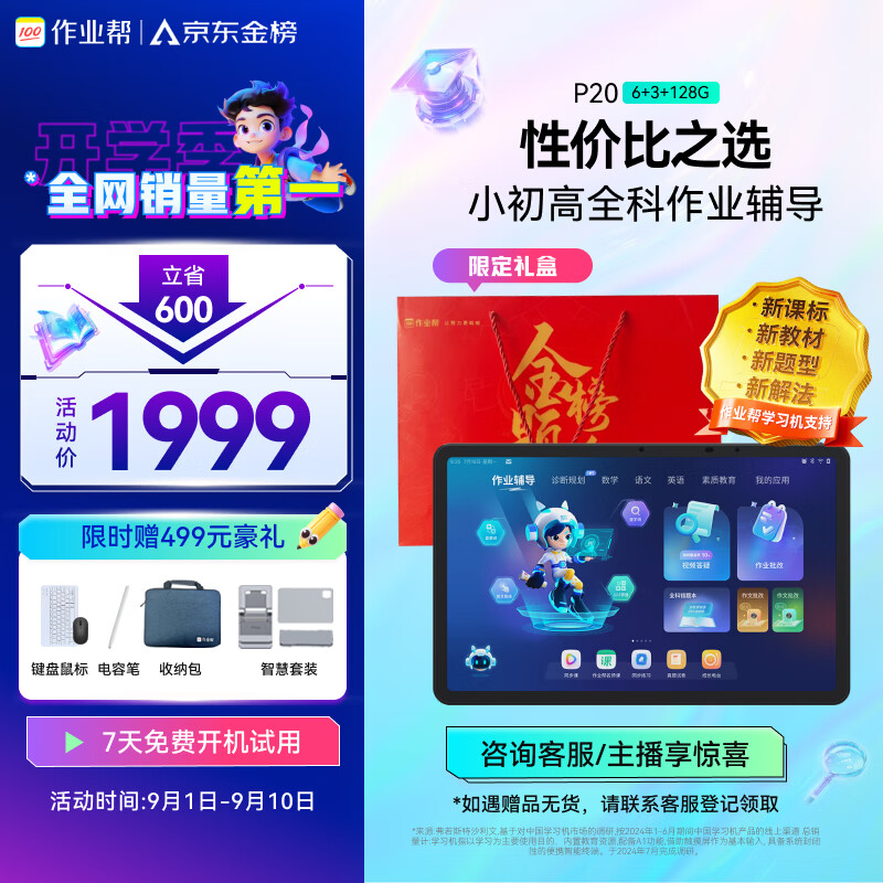 作业帮AI学习机P20 平板小学到高中全科作业辅导举一反三 精讲视频 家教机12''6+3+128G价格:1999.00元!