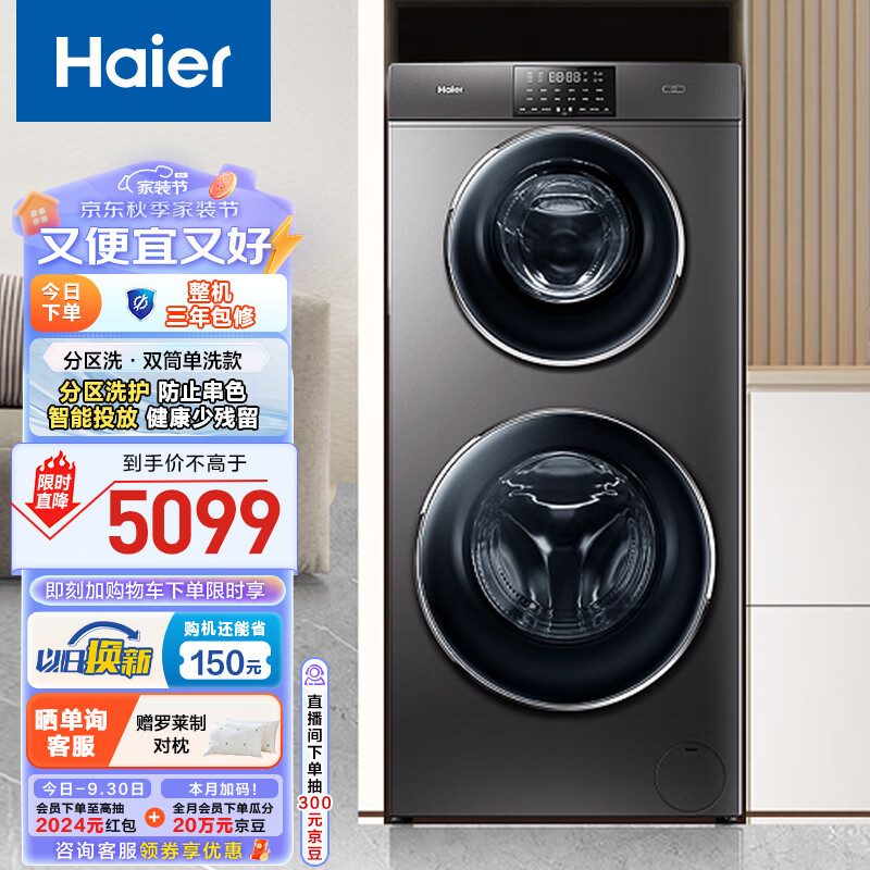 海尔(Haier)滚筒洗衣机全自动 双筒分区单洗款 4+9公斤 母婴儿童内衣 以旧换新家用大容量 XQGF130-B1258U1价格:5099.00元!