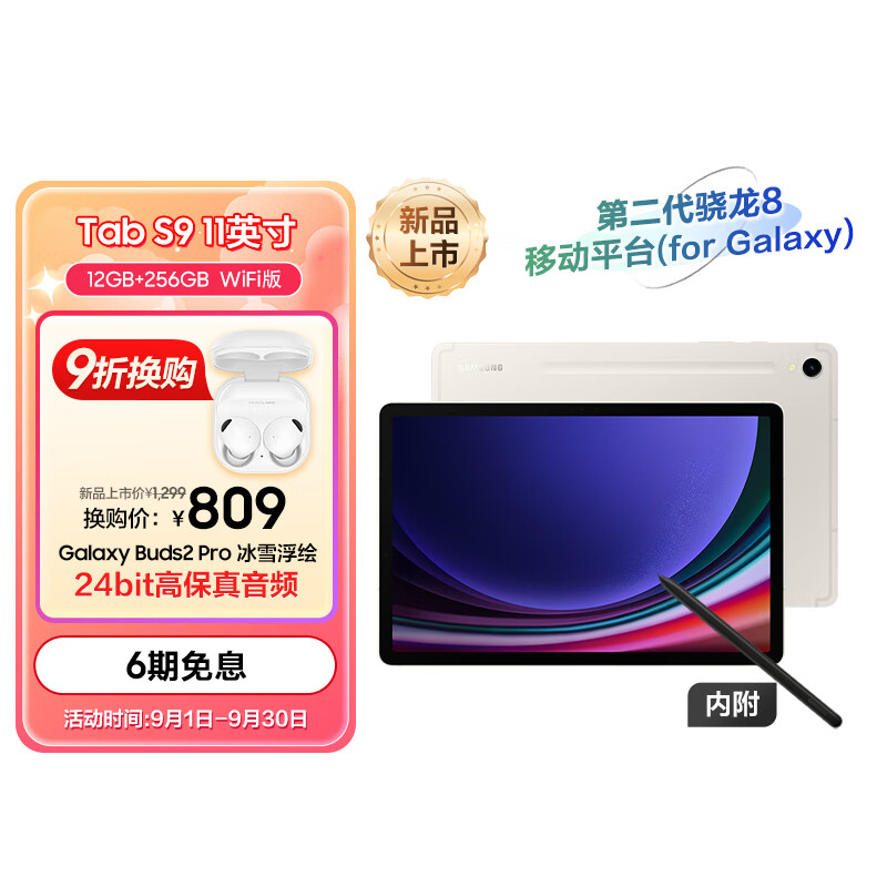 三星(SAMSUNG)平板电脑2023款Tab S9 11英寸 12G+256G WIFI 骁龙8Gen2 顺滑全视屏 内附Spen 云雾金价格:5908.00元!