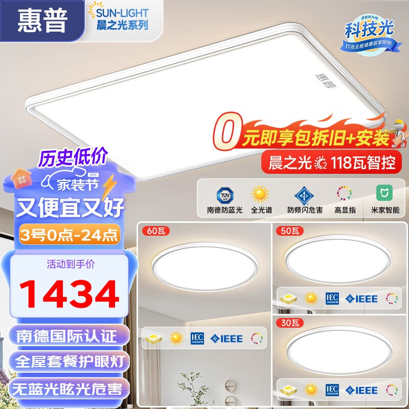 惠普全光谱护眼吸顶客厅卧室灯米家现代简约灯饰中山灯具全屋套餐F价格:2390.00元!