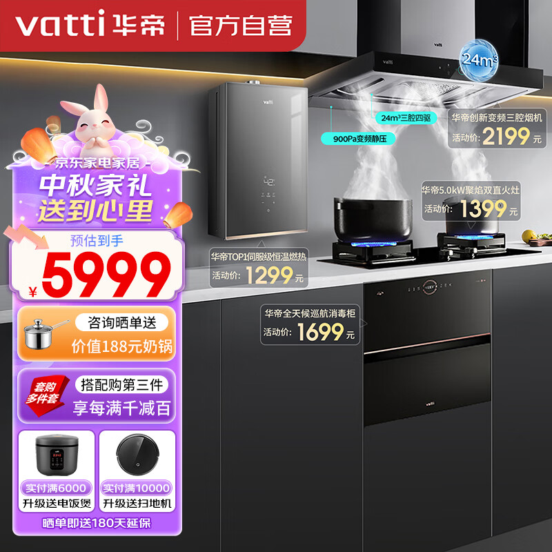 华帝(VATTI)抽油烟机创世S6燃气灶热水器消毒柜厨房多件套 i11206+72B+152-16+13036(天然气)价格:5999.00元!