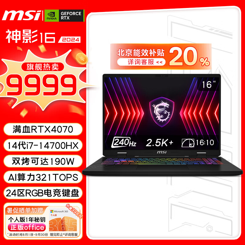 微星(MSI)【黑悟空推荐】神影16 2024 14代酷睿i7-14700HX 16英寸游戏本笔记本电脑(RTX4070 16GB 1T 2.5K屏价格:9999.00元!