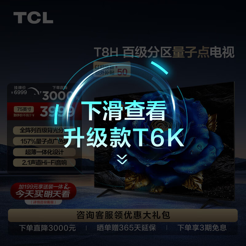 TCL电视 75T8H 75英寸 百级分区 QLED量子点 超薄 2.1声道音响 120Hz 客厅液晶智能平板游戏电视机价格:4299.00元!