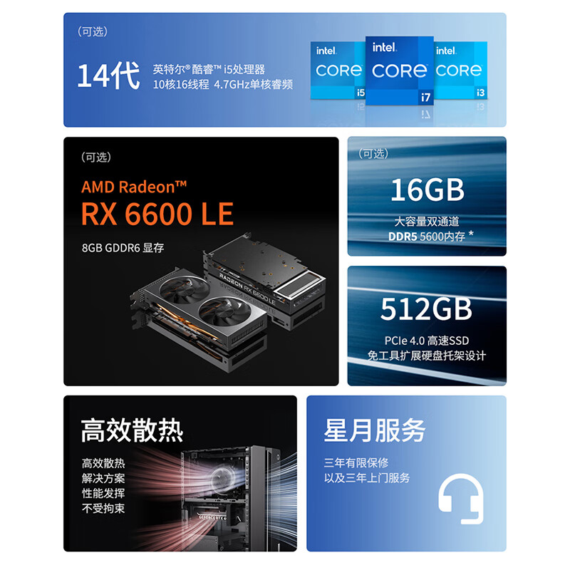 联想(Lenovo)GeekPro 设计师游戏台式电脑主机(酷睿14代i5-14400F RX6600LE 8GB显卡 16G 512G SSD )27英寸套装价格:5699.00元!